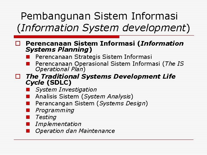 Pembangunan Sistem Informasi (Information System development) o Perencanaan Sistem Informasi (Information Systems Planning) n Perencanaan Strategis Sistem Informasi n Perencanaan Operasional Sistem Informasi (The IS Operational Plan) o The Traditional Systems Development Life Cycle (SDLC) n n n n System Investigation Analisis Sistem (System Analysis) Perancangan Sistem (Systems Design) Programming Testing Implementation Operation dan Maintenance