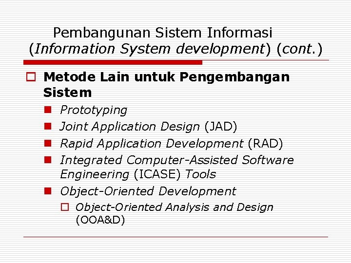 Pembangunan Sistem Informasi (Information System development) (cont. ) o Metode Lain untuk Pengembangan Sistem Prototyping Joint Application Design (JAD) Rapid Application Development (RAD) Integrated Computer-Assisted Software Engineering (ICASE) Tools n Object-Oriented Development n n o Object-Oriented Analysis and Design (OOA&D)