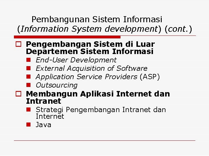 Pembangunan Sistem Informasi (Information System development) (cont. ) o Pengembangan Sistem di Luar Departemen Sistem Informasi n n End-User Development External Acquisition of Software Application Service Providers (ASP) Outsourcing o Membangun Aplikasi Internet dan Intranet n Strategi Pengembangan Intranet dan Internet n Java