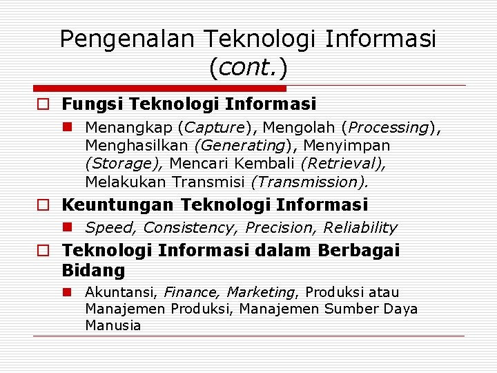 Pengenalan Teknologi Informasi (cont. ) o Fungsi Teknologi Informasi n Menangkap (Capture), Mengolah (Processing), Menghasilkan (Generating), Menyimpan (Storage), Mencari Kembali (Retrieval), Melakukan Transmisi (Transmission). o Keuntungan Teknologi Informasi n Speed, Consistency, Precision, Reliability o Teknologi Informasi dalam Berbagai Bidang n Akuntansi, Finance, Marketing, Produksi atau Manajemen Produksi, Manajemen Sumber Daya Manusia