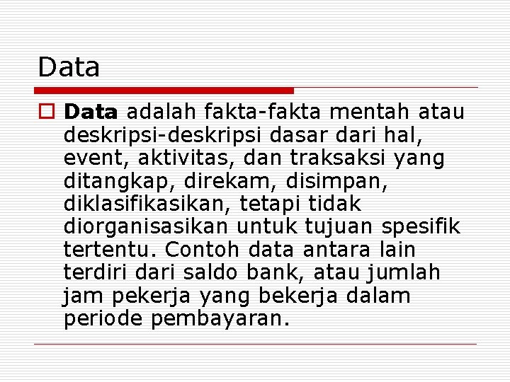 Data o Data adalah fakta-fakta mentah atau deskripsi-deskripsi dasar dari hal, event, aktivitas, dan traksaksi yang ditangkap, direkam, disimpan, diklasifikasikan, tetapi tidak diorganisasikan untuk tujuan spesifik tertentu. Contoh data antara lain terdiri dari saldo bank, atau jumlah jam pekerja yang bekerja dalam periode pembayaran.