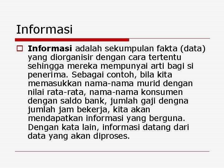 Informasi o Informasi adalah sekumpulan fakta (data) yang diorganisir dengan cara tertentu sehingga mereka mempunyai arti bagi si penerima. Sebagai contoh, bila kita memasukkan nama-nama murid dengan nilai rata-rata, nama-nama konsumen dengan saldo bank, jumlah gaji dengna jumlah jam bekerja, kita akan mendapatkan informasi yang berguna. Dengan kata lain, informasi datang dari data yang akan diproses.