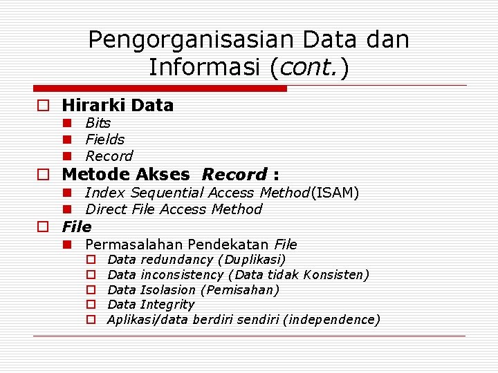 Pengorganisasian Data dan Informasi (cont. ) o Hirarki Data n Bits n Fields n Record o Metode Akses Record : n Index Sequential Access Method(ISAM) n Direct File Access Method o File n Permasalahan Pendekatan File o o o Data redundancy (Duplikasi) Data inconsistency (Data tidak Konsisten) Data Isolasion (Pemisahan) Data Integrity Aplikasi/data berdiri sendiri (independence)