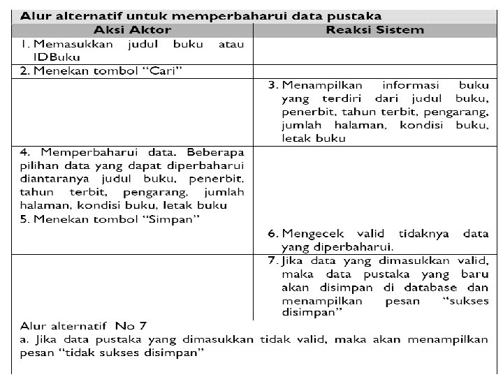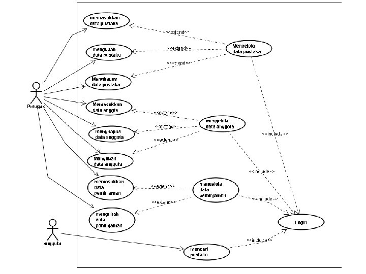 6. Proses pendaftaran pustaka, anggota, dan peminjaman dilakukan oleh petugas perpustakaan. 7. Anggota dan pengunjung dapat melakukan pencarian pustaka. • Sistem informasi yang akan dibuat adalah aplikasi berbasis web. Manajemen perpustakaan meliputi fungsi-fungsi sebagai berikut: 1. Mengelola data pustaka, meliputi: a. Memasukkan data pustaka b. Mengubah data pustaka c. Menghapus data pustaka 2. Mengelola data anggota, meliputi: a. Memasukkan data anggota b. Mengubah data anggota c. Menghapus data anggota 3. Mengelola data peminjaman, meliputi: a. Memasukkan data peminjaman b. Mengubah data peminjaman (mekanisme pengembalian pustaka) 4. Mencari pustaka