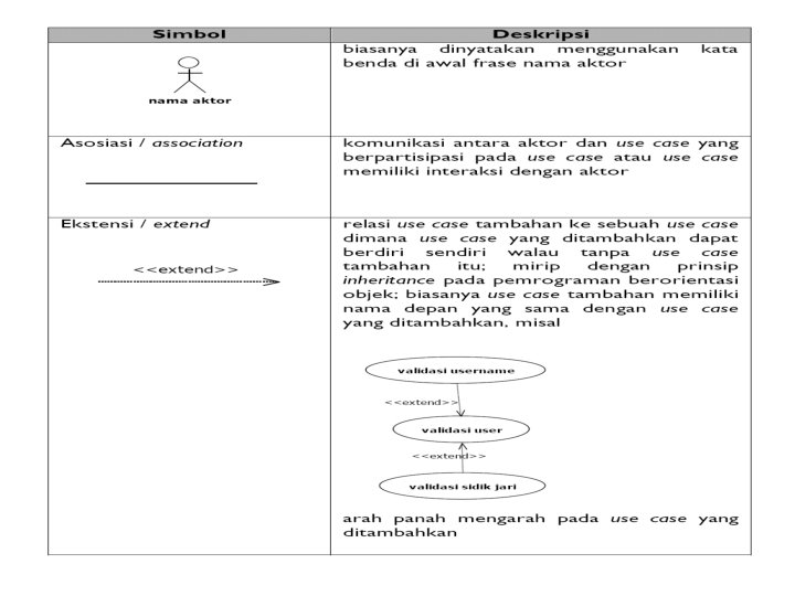 Use Case • Pemodelan untuk menggambarkan kelakuan (behavior) sistem yang akan dibuat. • Diagram use case mendeskripsikan sebuah interaksi antara satu atau lebih aktor dengan sistem yang akan dibuat • Terdapat beberapa simbol dalam menggambarkan diagram use case, yaitu use cases, aktor dan relasi.