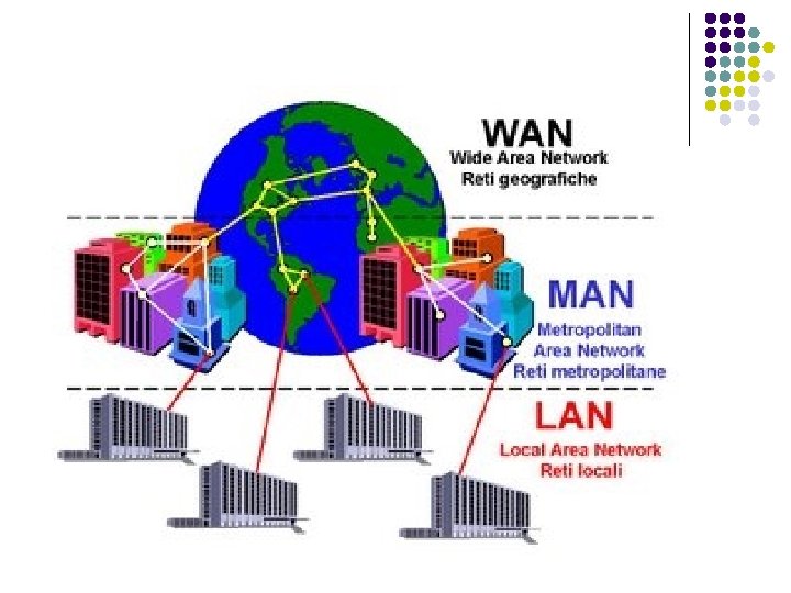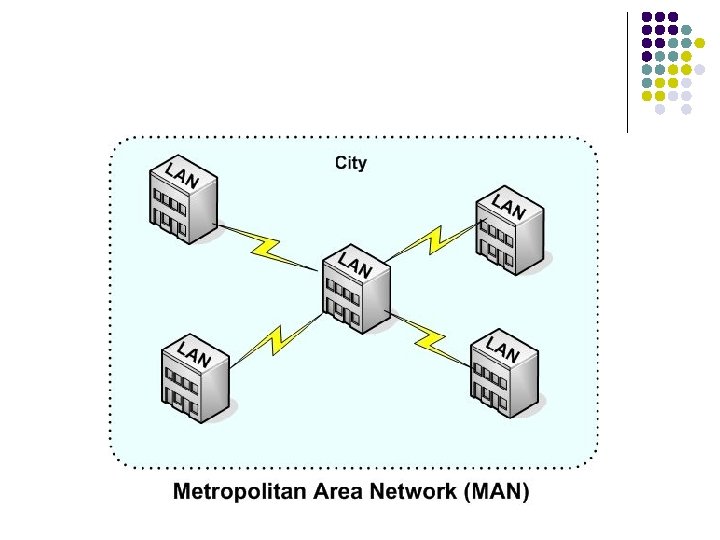 Macam Network 2. Metropolitan Area Network (MAN) l l l Pengembangan dari LAN Jaringan komputer ini terdiri dari beberapa jaringan LAN yang saling berhubungan letak jaringan ini bisa saling berjauhan. MAN adalah jaringan komputer yang biasanya mencakup sebuah kota atau kampus besar.