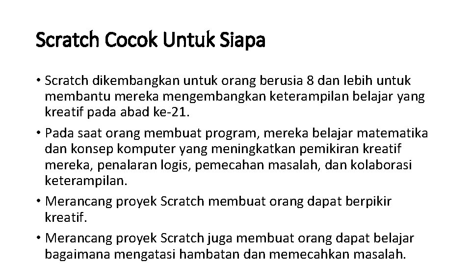 Scratch Cocok Untuk Siapa • Scratch dikembangkan untuk orang berusia 8 dan lebih untuk membantu mereka mengembangkan keterampilan belajar yang kreatif pada abad ke-21. • Pada saat orang membuat program, mereka belajar matematika dan konsep komputer yang meningkatkan pemikiran kreatif mereka, penalaran logis, pemecahan masalah, dan kolaborasi keterampilan. • Merancang proyek Scratch membuat orang dapat berpikir kreatif. • Merancang proyek Scratch juga membuat orang dapat belajar bagaimana mengatasi hambatan dan memecahkan masalah.