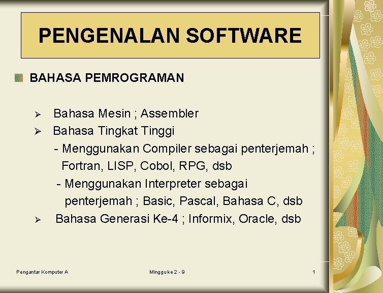 PENGENALAN SOFTWARE BAHASA PEMROGRAMAN Bahasa Mesin ; Assembler Ø Bahasa Tingkat Tinggi - Menggunakan Compiler sebagai penterjemah ; Fortran, LISP, Cobol, RPG, dsb - Menggunakan Interpreter sebagai penterjemah ; Basic, Pascal, Bahasa C, dsb Ø Bahasa Generasi Ke-4 ; Informix, Oracle, dsb Ø Pengantar Komputer A Minggu ke 2 - 9 1