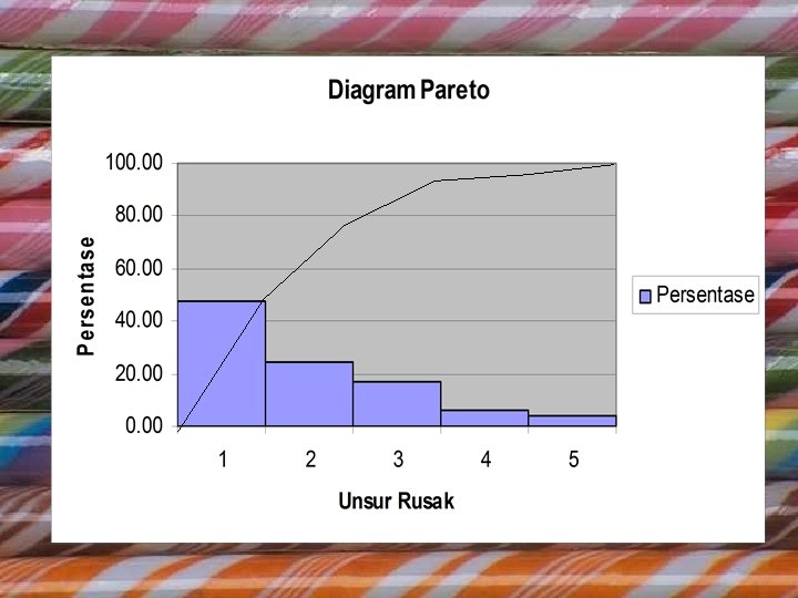 Diagram Pareto Pengertian dan Tujuan Diagram Pareto merupakan grafik batang khusus yang dapat digunakan sebagai alat interpretasi dalam : q Menentukan frekuensi atau tingkat kepentingan relatif dari berbagai persoalan atau sebab q Memfokuskan pada pokok persoalan vital dengan cara mengurutkan berdasarkan kepentingan