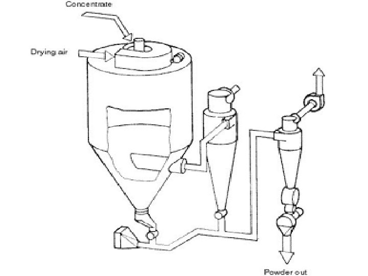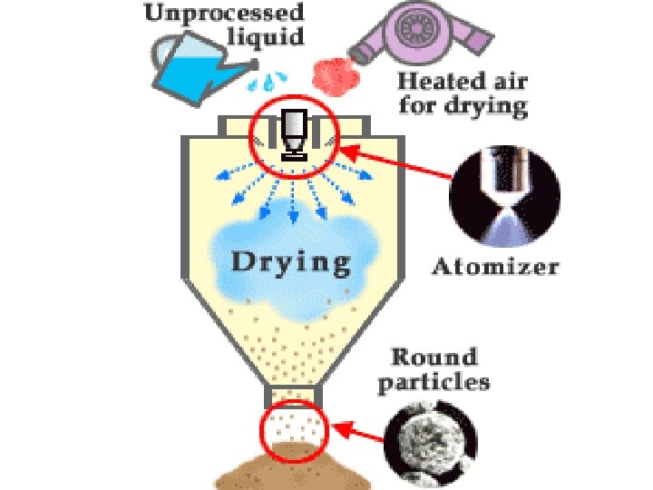 Bagian dari spray dryer • Pemanas dan fan untuk menghasilkan udara panas pada suhu dan kecepatan tertentu • Atomizer atau jet untuk menghasilkan partikel-partikel cair dengan ukuran tertentu • Chamber dimana partikel cair kontak dengan udara panas • Tempat produk kering