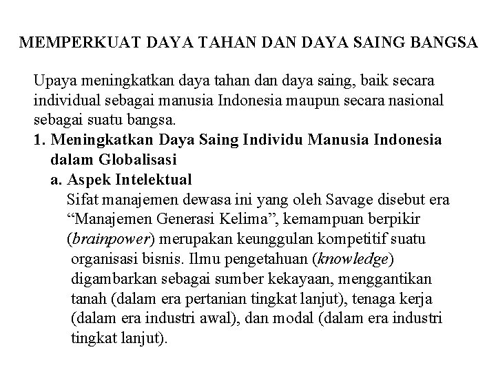 MEMPERKUAT DAYA TAHAN DAYA SAING BANGSA Upaya meningkatkan daya tahan daya saing, baik secara individual sebagai manusia Indonesia maupun secara nasional sebagai suatu bangsa. 1. Meningkatkan Daya Saing Individu Manusia Indonesia dalam Globalisasi a. Aspek Intelektual Sifat manajemen dewasa ini yang oleh Savage disebut era “Manajemen Generasi Kelima”, kemampuan berpikir (brainpower) merupakan keunggulan kompetitif suatu organisasi bisnis. Ilmu pengetahuan (knowledge) digambarkan sebagai sumber kekayaan, menggantikan tanah (dalam era pertanian tingkat lanjut), tenaga kerja (dalam era industri awal), dan modal (dalam era industri tingkat lanjut).
