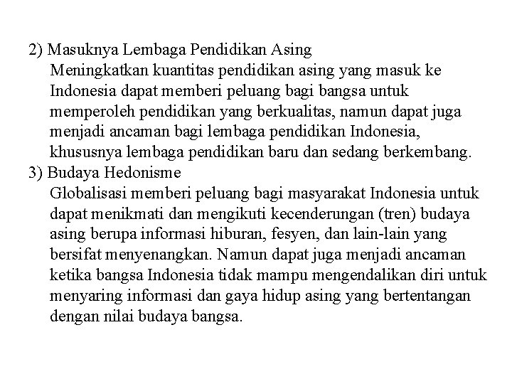 2) Masuknya Lembaga Pendidikan Asing Meningkatkan kuantitas pendidikan asing yang masuk ke Indonesia dapat memberi peluang bagi bangsa untuk memperoleh pendidikan yang berkualitas, namun dapat juga menjadi ancaman bagi lembaga pendidikan Indonesia, khususnya lembaga pendidikan baru dan sedang berkembang. 3) Budaya Hedonisme Globalisasi memberi peluang bagi masyarakat Indonesia untuk dapat menikmati dan mengikuti kecenderungan (tren) budaya asing berupa informasi hiburan, fesyen, dan lain-lain yang bersifat menyenangkan. Namun dapat juga menjadi ancaman ketika bangsa Indonesia tidak mampu mengendalikan diri untuk menyaring informasi dan gaya hidup asing yang bertentangan dengan nilai budaya bangsa.