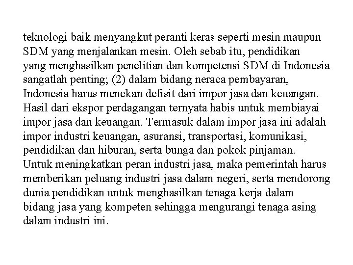 teknologi baik menyangkut peranti keras seperti mesin maupun SDM yang menjalankan mesin. Oleh sebab itu, pendidikan yang menghasilkan penelitian dan kompetensi SDM di Indonesia sangatlah penting; (2) dalam bidang neraca pembayaran, Indonesia harus menekan defisit dari impor jasa dan keuangan. Hasil dari ekspor perdagangan ternyata habis untuk membiayai impor jasa dan keuangan. Termasuk dalam impor jasa ini adalah impor industri keuangan, asuransi, transportasi, komunikasi, pendidikan dan hiburan, serta bunga dan pokok pinjaman. Untuk meningkatkan peran industri jasa, maka pemerintah harus memberikan peluang industri jasa dalam negeri, serta mendorong dunia pendidikan untuk menghasilkan tenaga kerja dalam bidang jasa yang kompeten sehingga mengurangi tenaga asing dalam industri ini.