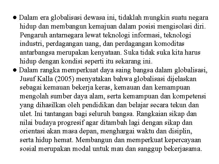 ● Dalam era globalisasi dewasa ini, tidaklah mungkin suatu negara hidup dan membangun kemajuan dalam posisi mengisolasi diri. Pengaruh antarnegara lewat teknologi informasi, teknologi industri, perdagangan uang, dan perdagangan komoditas antarbangsa merupakan kenyataan. Suka tidak suka kita harus hidup dengan kondisi seperti itu sekarang ini. ● Dalam rangka memperkuat daya saing bangsa dalam globalisasi, Jusuf Kalla (2005) menyatakan bahwa globalisasi dijelaskan sebagai kemauan bekerja keras, kemauan dan kemampuan mengolah sumber daya alam, serta kemampuan dan kompetensi yang dihasilkan oleh pendidikan dan belajar secara tekun dan ulet. Ini tantangan bagi seluruh bangsa. Rangkaian sikap dan nilai budaya progresif agar ditambah lagi dengan sikap dan orientasi akan masa depan, menghargai waktu dan disiplin, serta hidup hemat. Membangun dan memperkuat kepercayaan sosial merupakan modal untuk mau dan sanggup bekerjasama.