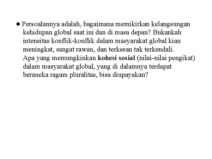 ● Persoalannya adalah, bagaimana memikirkan kelangsungan kehidupan global saat ini dan di masa depan? Bukankah intensitas konflik-konflik dalam masyarakat global kian meningkat, sangat rawan, dan terkesan tak terkendali. Apa yang memungkinkan kohesi sosial (nilai-nilai pengikat) dalam masyarakat global, yang di dalamnya terdapat beraneka ragam pluralitas, bisa diupayakan?