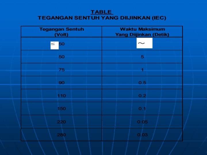 LISTRIK SENTUH LANGSUNG & SENTUH TIDAK LANGSUNG PADA INSTALASI LISTRIK BISA BERBAHAYA ATAU TIDAK TERGANTUNG DARI : TEGANGAN ARUS WAKTU dan KONDISI BADAN MANUSIANYA.