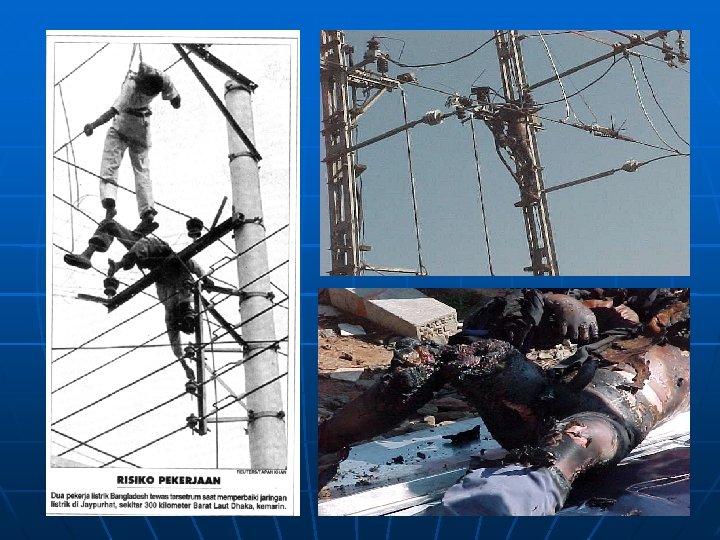 Tegangan sentuh yang berbahaya: PROTEKSI BAHAYA “JARAK AMAN” > 50 V di ruang normal, > 25 V di ruangan lembab Daya > 100 Watt Jarak aman atau diluar jangkauan Tegangan k. V Jarak (cm) 1 50 12 60 20 75 70 100 150 125 220 160 500 300