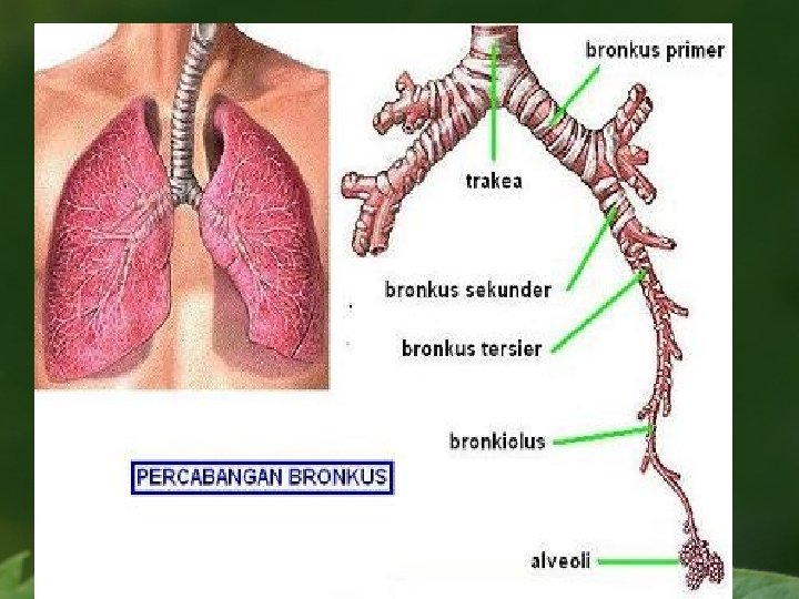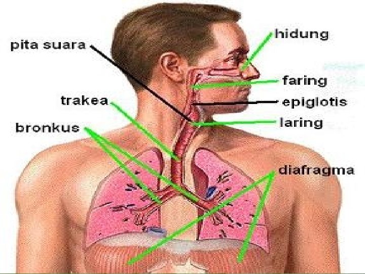 • Saluran nafas yang dilalui udara adalah hidung, faring, laring, trakea, bronkus, bronkiolus dan alveoli. • Di dalamnya terdapat suatu sistem yang sedemikian rupa dapat menghangatkan udara sebelum sampai ke alveoli. • Terdapat juga suatu sistem pertahanan yang memungkinkan kotoran atau benda asing yang masuk dapat dikeluarkan baik melalui batuk ataupun bersin.