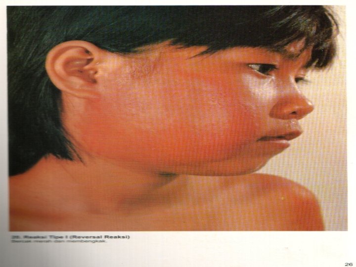 Reaksi kusta Tipe 1 = Reaksi Reversal Sistem Kekebalan Tubuh Body’s immune system (Respons seluler) kuman kusta serang !! Kulit merah, bengkak, panas nyeri tekan dan ggn fungsi saraf “perang” peradanga n kulit