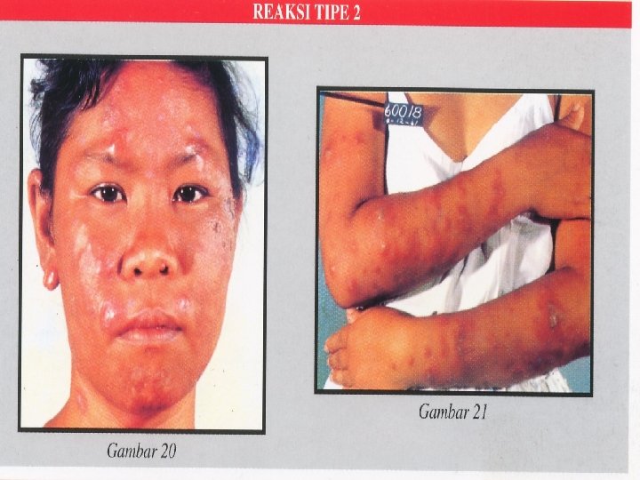 No 1 Gejala Kulit Reaksi Tipe I Ringan Bercak Merah, tebal, panas, nyeri Berat Bercak Ber + Sampai pecah Reaksi Tipe II Ringan Nodul Merah, panas, nyeri Berat Nodul Ber + Sampai pecah Saraf tepi : Nyeri - + Ganguan fungsi - + 3 Demam - ± ± + 4 Gangguan organ lain - - - + 2