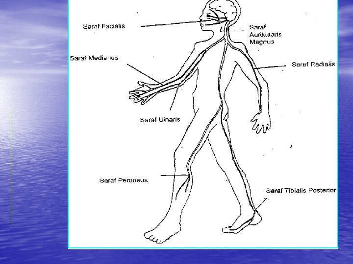 FUNGSI SARAF Motorik Sensorik Facialis Kelopak mata tidak bisa menutup - Ulnaris Jari tangan ke 4 dan 5 lemah / lumpuh / kiting Mati rasa telapak bagian tangan jari ke 4 dan 5 Medianus Tangan lunglai Mati rasa telapak tangan jari ke 1, 2, 3 Peroneus Kaki semper Tibialis posterior Jari kaki kiting Mati rasa telapak kaki Otonom Kekeringan, kulit retak dan bengkak akibat kerusakan kelenjar keringat, minyak dan aliran darah.