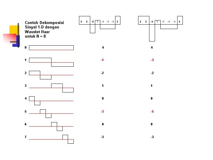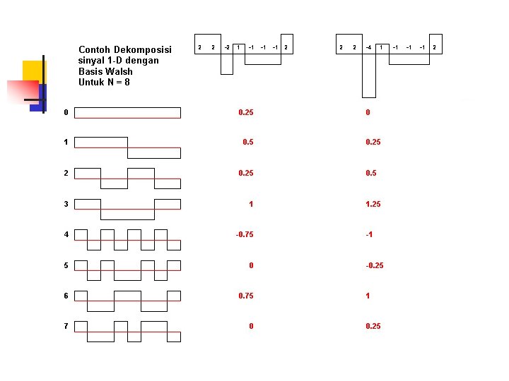 Contoh n n n Contoh pada halaman berikut menggambarkan dekomposisi 2 buah sinyal yang hampir sama Jika didekomposisi menggunakan basis Walsh, maka semua koefisien dekomposisinya memiliki nilai yang berbeda (ditunjukkan dengan warna merah), sedangkan jika didekomposisi menggunakan wavelet Haar, koefisien dekomposisinya tidak terlalu banyak berbeda. Hal ini disebabkan basis Walsh (dan FT) sama-sama bersifat periodik, sehingga sulit mengubah satu bagian tanpa mempengaruhi bagian lainnya.