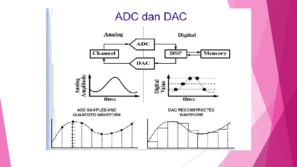 Proses Konversi Proses konversi – Pencuplikan (sampling) Mengubah sinyal waktu kontinyu menjadi sinyal waktu diskrit Parameter: frekuensi sampling – Kuantisasi Mengubah sinyal amplitudo kontinyu menjadi sinyal amplitudo diskrit Parameter: jumlah representasi bit – Pengkodean Mengkodekan sinyal diskrit dalam representasi binernya