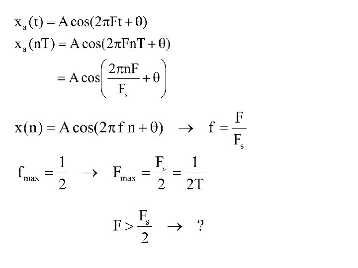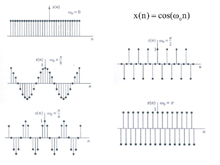 § Sinyal-sinyal sinusoidal waktu diskrit dengan frekuensi yang berbeda sebanyak 2 k adalah identik (tidak dapat dibedakan) § Frekuensi diperbesar harga maksimum f = 1/2