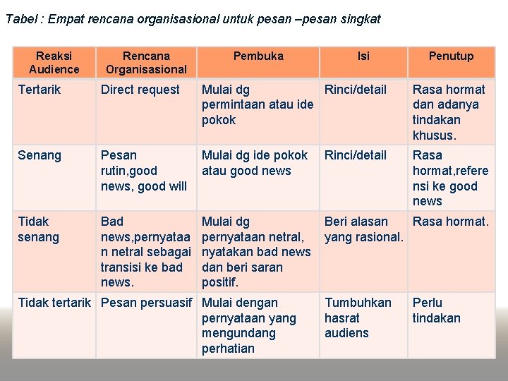 Tabel : Empat rencana organisasional untuk pesan –pesan singkat Reaksi Audience Rencana Organisasional Pembuka Isi Penutup Tertarik Direct request Mulai dg Rinci/detail permintaan atau ide pokok Rasa hormat dan adanya tindakan khusus. Senang Pesan rutin, good news, good will Mulai dg ide pokok atau good news Rinci/detail Rasa hormat, refere nsi ke good news Tidak senang Bad news, pernyataa n netral sebagai transisi ke bad news. Mulai dg pernyataan netral, nyatakan bad news dan beri saran positif. Beri alasan Rasa hormat. yang rasional. Tidak tertarik Pesan persuasif Mulai dengan pernyataan yang mengundang perhatian Tumbuhkan hasrat audiens Perlu tindakan