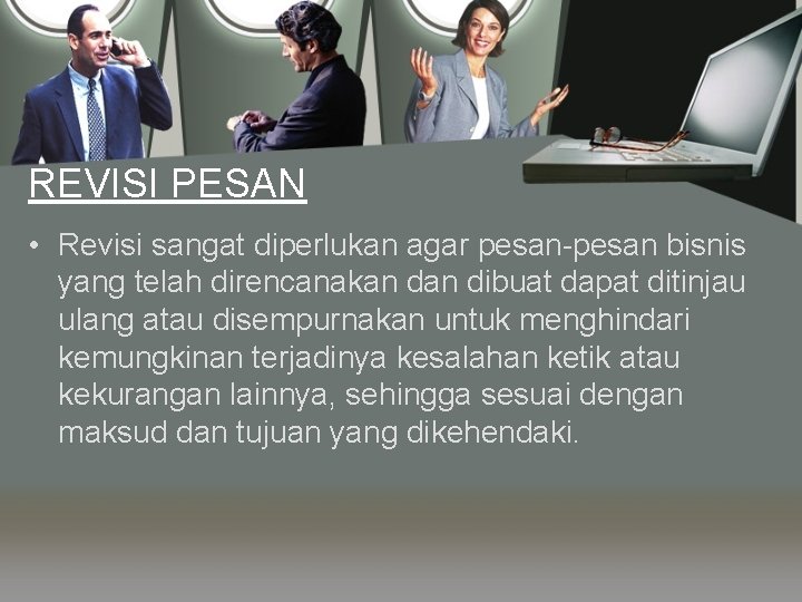 REVISI PESAN • Revisi sangat diperlukan agar pesan-pesan bisnis yang telah direncanakan dibuat dapat ditinjau ulang atau disempurnakan untuk menghindari kemungkinan terjadinya kesalahan ketik atau kekurangan lainnya, sehingga sesuai dengan maksud dan tujuan yang dikehendaki.