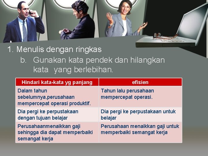 1. Menulis dengan ringkas b. Gunakan kata pendek dan hilangkan kata yang berlebihan. Hindari kata-kata yg panjang efisien Dalam tahun sebelumnya, perusahaan mempercepat operasi produktif. Tahun lalu perusahaan mempercepat operasi. Dia pergi ke perpustakaan dengan tujuan belajar Dia pergi ke perpustakaan untuk belajar Perusahaanmenaikkan gaji sehingga dia dapat memperbaiki semangat kerja Perusahaan menaikkan gaji untuk memperbaiki semangat kerja