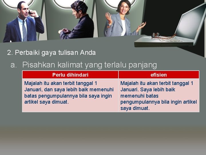 2. Perbaiki gaya tulisan Anda a. Pisahkan kalimat yang terlalu panjang Perlu dihindari efisien Majalah itu akan terbit tanggal 1 Januari, dan saya lebih baik memenuhi batas pengumpulannya bila saya ingin artikel saya dimuat. Majalah itu akan terbit tanggal 1 Januari. Saya lebih baik memenuhi batas pengumpulannya bila ingin artikel saya dimuat.