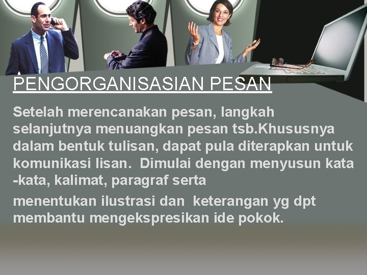 PENGORGANISASIAN PESAN Setelah merencanakan pesan, langkah selanjutnya menuangkan pesan tsb. Khususnya dalam bentuk tulisan, dapat pula diterapkan untuk komunikasi lisan. Dimulai dengan menyusun kata -kata, kalimat, paragraf serta menentukan ilustrasi dan keterangan yg dpt membantu mengekspresikan ide pokok.