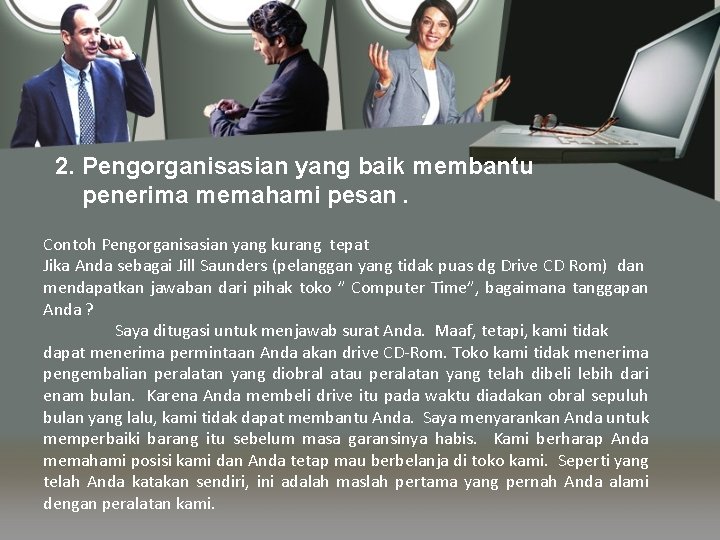 2. Pengorganisasian yang baik membantu penerima memahami pesan. Contoh Pengorganisasian yang kurang tepat Jika Anda sebagai Jill Saunders (pelanggan yang tidak puas dg Drive CD Rom) dan mendapatkan jawaban dari pihak toko ” Computer Time”, bagaimana tanggapan Anda ? Saya ditugasi untuk menjawab surat Anda. Maaf, tetapi, kami tidak dapat menerima permintaan Anda akan drive CD-Rom. Toko kami tidak menerima pengembalian peralatan yang diobral atau peralatan yang telah dibeli lebih dari enam bulan. Karena Anda membeli drive itu pada waktu diadakan obral sepuluh bulan yang lalu, kami tidak dapat membantu Anda. Saya menyarankan Anda untuk memperbaiki barang itu sebelum masa garansinya habis. Kami berharap Anda memahami posisi kami dan Anda tetap mau berbelanja di toko kami. Seperti yang telah Anda katakan sendiri, ini adalah maslah pertama yang pernah Anda alami dengan peralatan kami.