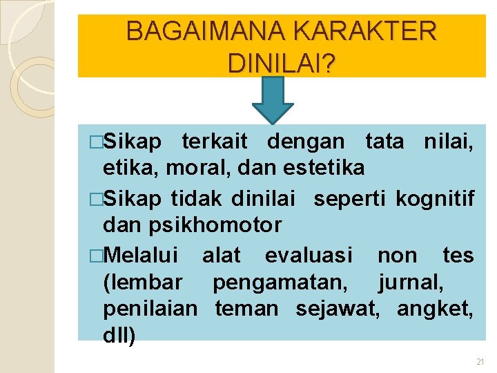 BAGAIMANA KARAKTER DINILAI? �Sikap terkait dengan tata nilai, etika, moral, dan estetika �Sikap tidak dinilai seperti kognitif dan psikhomotor �Melalui alat evaluasi non tes (lembar pengamatan, jurnal, penilaian teman sejawat, angket, dll) 21
