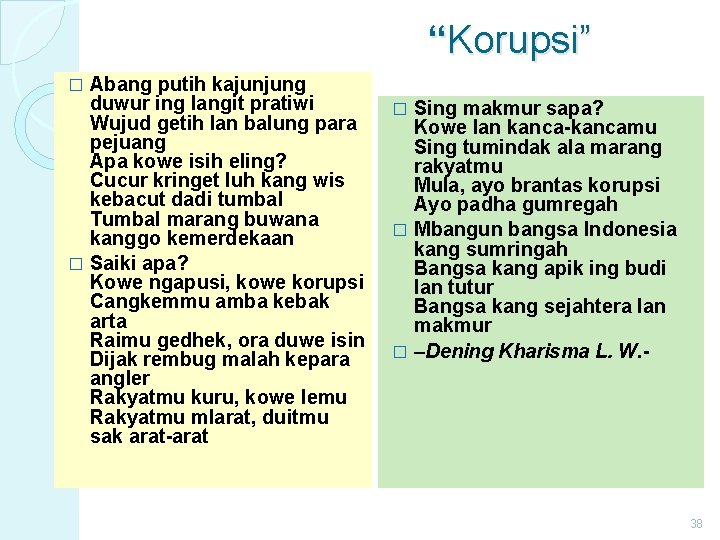 “Korupsi” Abang putih kajunjung duwur ing langit pratiwi Wujud getih lan balung para pejuang Apa kowe isih eling? Cucur kringet luh kang wis kebacut dadi tumbal Tumbal marang buwana kanggo kemerdekaan � Saiki apa? Kowe ngapusi, kowe korupsi Cangkemmu amba kebak arta Raimu gedhek, ora duwe isin Dijak rembug malah kepara angler Rakyatmu kuru, kowe lemu Rakyatmu mlarat, duitmu sak arat-arat � Sing makmur sapa? Kowe lan kanca-kancamu Sing tumindak ala marang rakyatmu Mula, ayo brantas korupsi Ayo padha gumregah � Mbangun bangsa Indonesia kang sumringah Bangsa kang apik ing budi lan tutur Bangsa kang sejahtera lan makmur � –Dening Kharisma L. W. � 38