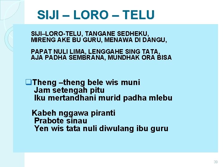 SIJI – LORO – TELU SIJI–LORO-TELU, TANGANE SEDHEKU, MIRENG AKE BU GURU, MENAWA DI DANGU, PAPAT NULI LIMA, LENGGAHE SING TATA, AJA PADHA SEMBRANA, MUNDHAK ORA BISA q. Theng –theng bele wis muni Jam setengah pitu Iku mertandhani murid padha mlebu Kabeh nggawa piranti Prabote sinau Yen wis tata nuli diwulang ibu guru 39