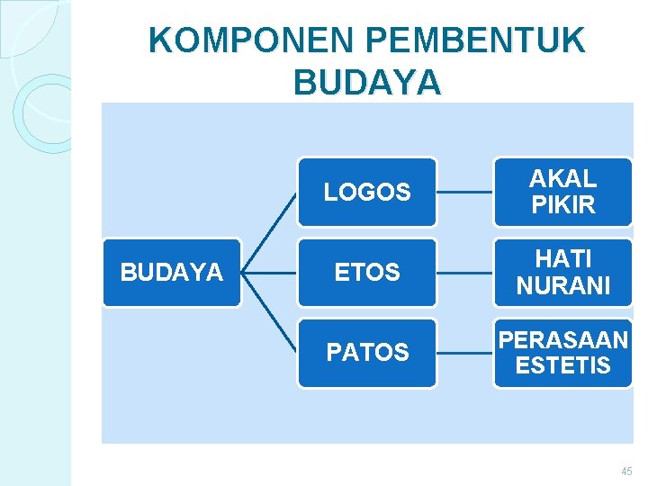 KOMPONEN PEMBENTUK BUDAYA LOGOS AKAL PIKIR ETOS HATI NURANI PATOS PERASAAN ESTETIS 45