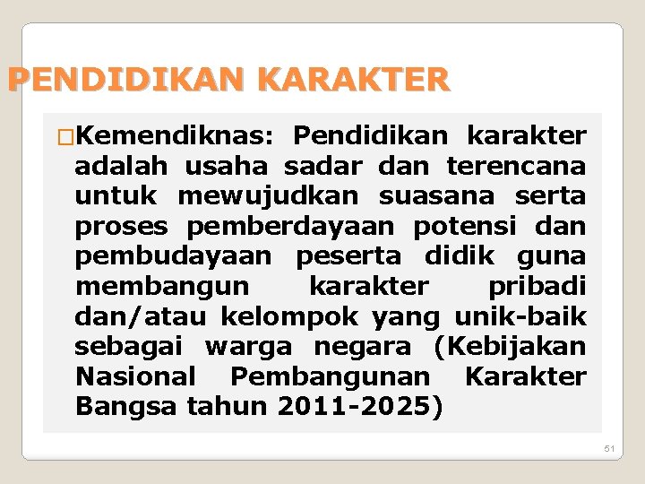 PENDIDIKAN KARAKTER �Kemendiknas: Pendidikan karakter adalah usaha sadar dan terencana untuk mewujudkan suasana serta proses pemberdayaan potensi dan pembudayaan peserta didik guna membangun karakter pribadi dan/atau kelompok yang unik-baik sebagai warga negara (Kebijakan Nasional Pembangunan Karakter Bangsa tahun 2011 -2025) 51