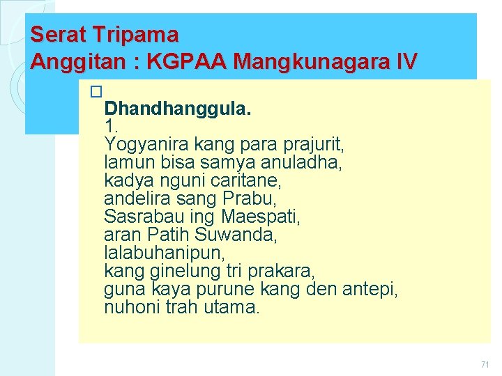 Serat Tripama Anggitan : KGPAA Mangkunagara IV � Dhandhanggula. 1. Yogyanira kang para prajurit, lamun bisa samya anuladha, kadya nguni caritane, andelira sang Prabu, Sasrabau ing Maespati, aran Patih Suwanda, lalabuhanipun, kang ginelung tri prakara, guna kaya purune kang den antepi, nuhoni trah utama. 71