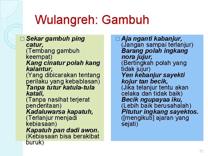 Wulangreh: Gambuh � Sekar gambuh ping catur, (Tembang gambuh keempat) Kang cinatur polah kang kalantur, (Yang dibicarakan tentang perilaku yang kebablasan) Tanpa tutur katula-tula katali, (Tanpa nasihat terjerat penderitaan) Kadaluwarsa kapatuh, (Terlanjur menjadi kebiasaan) Kapatuh pan dadi awon. (Kebiasaan bisa berakibat buruk) � Aja nganti kabanjur, (Jangan sampai terlanjur) Barang polah ingkang nora jujur, (Bertingkah polah yang tidak jujur) Yen kebanjur sayekti kojur tan becik, (Jika telanjur tentu akan celaka dan tidak baik) Becik ngupayaa iku, (Lebih baik berusahalah) Pitutur ingkang sayektos. ([mengikuti] ajaran yang sejati) 73