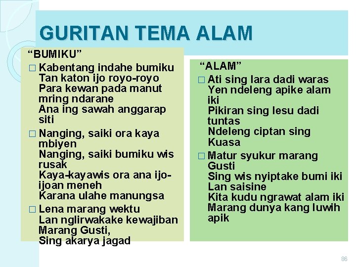 GURITAN TEMA ALAM “BUMIKU” � Kabentang indahe bumiku Tan katon ijo royo-royo Para kewan pada manut mring ndarane Ana ing sawah anggarap siti � Nanging, saiki ora kaya mbiyen Nanging, saiki bumiku wis rusak Kaya-kayawis ora ana ijoijoan meneh Karana ulahe manungsa � Lena marang wektu Lan nglirwakake kewajiban Marang Gusti, Sing akarya jagad “ALAM” � Ati sing lara dadi waras Yen ndeleng apike alam iki Pikiran sing lesu dadi tuntas Ndeleng ciptan sing Kuasa � Matur syukur marang Gusti Sing wis nyiptake bumi iki Lan saisine Kita kudu ngrawat alam iki Marang dunya kang luwih apik 86