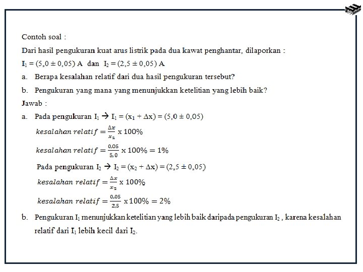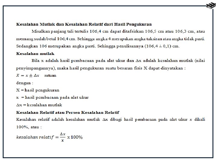 Ketidakpastian Mutlak dan Relatif Pengukuran tunggal maupun pengukuran berulang hasilnya dilapordkan sebagai x = x 0± Δx Δx dinamai ketidakpastian mutlak. Ketidakrelatif, yaitu Δx/x. Makin kecil ketidakpastian relatif, makin tinggi ketelitian pengukuran tersebut.