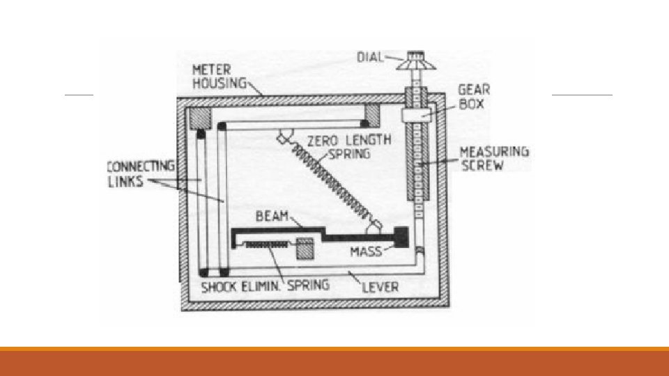 Relative Gravimeter §Hanya mengukur perubahan pada gravitasi §Idenya adalah untuk menggantung bukti massa ke skala pegas, jika gravitasi berubah (dan bukti massa tidak ) maka peregangan pegas akan berubah §Gravimeter relative membutuhkan kalibrasi (gravitasi yang diketahui dari arus, perubahan elevasi)