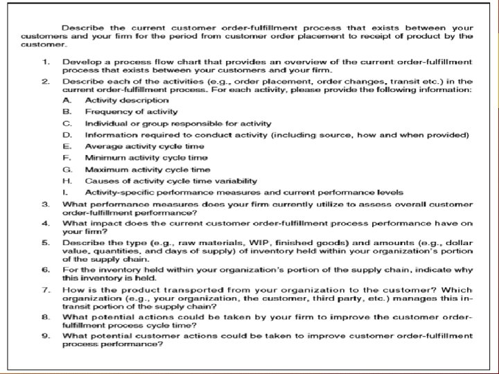 Peluang mereduksi Cycle Time pada Supply Chain Peluang mereduksi cycle time pada supply chain baik intra-organizational and inter-rganizational Aktivitas spesifik supply chain yang berpeluang untuk direduksi ü Materials planning and scheduling Customer order processing ü Purchase order cycle ü Warehousing operations ü Inbound transportation ü Outbound transportation ü Material receipt/inspection ü Return materials/reverse ü Material review activities ü logistics ü Manufacturing processes