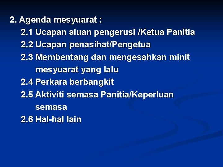 2. Agenda mesyuarat : 2. 1 Ucapan aluan pengerusi /Ketua Panitia 2. 2 Ucapan penasihat/Pengetua 2. 3 Membentang dan mengesahkan minit mesyuarat yang lalu 2. 4 Perkara berbangkit 2. 5 Aktiviti semasa Panitia/Keperluan semasa 2. 6 Hal-hal lain