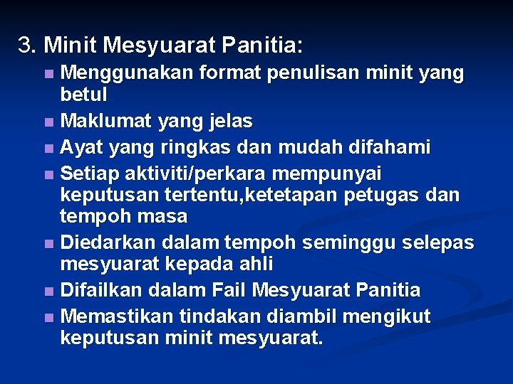 3. Minit Mesyuarat Panitia: Menggunakan format penulisan minit yang betul n Maklumat yang jelas n Ayat yang ringkas dan mudah difahami n Setiap aktiviti/perkara mempunyai keputusan tertentu, ketetapan petugas dan tempoh masa n Diedarkan dalam tempoh seminggu selepas mesyuarat kepada ahli n Difailkan dalam Fail Mesyuarat Panitia n Memastikan tindakan diambil mengikut keputusan minit mesyuarat. n