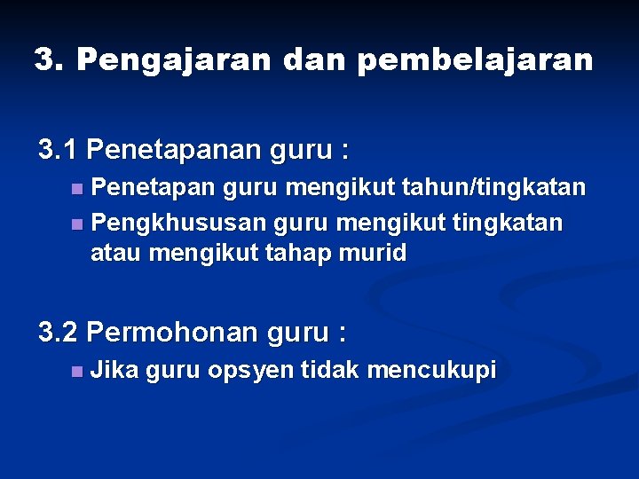 3. Pengajaran dan pembelajaran 3. 1 Penetapanan guru : Penetapan guru mengikut tahun/tingkatan n Pengkhususan guru mengikut tingkatan atau mengikut tahap murid n 3. 2 Permohonan guru : n Jika guru opsyen tidak mencukupi