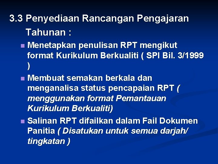 3. 3 Penyediaan Rancangan Pengajaran Tahunan : Menetapkan penulisan RPT mengikut format Kurikulum Berkualiti ( SPI Bil. 3/1999 ) n Membuat semakan berkala dan menganalisa status pencapaian RPT ( menggunakan format Pemantauan Kurikulum Berkualiti) n Salinan RPT difailkan dalam Fail Dokumen Panitia ( Disatukan untuk semua darjah/ tingkatan ) n