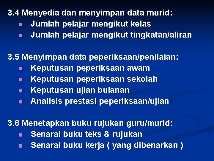 3. 4 Menyedia dan menyimpan data murid: n Jumlah pelajar mengikut kelas n Jumlah pelajar mengikut tingkatan/aliran 3. 5 Menyimpan data peperiksaan/penilaian: n Keputusan peperiksaan awam n Keputusan peperiksaan sekolah n Keputusan ujian bulanan n Analisis prestasi peperiksaan/ujian 3. 6 Menetapkan buku rujukan guru/murid: n Senarai buku teks & rujukan n Senarai buku kerja ( yang dibenarkan )